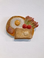 こんがりトーストととろーり目玉焼き 画鋲で壁に飾ることができます お部屋のインテリアに 素材:クスノキ 大きさ:19×16cm